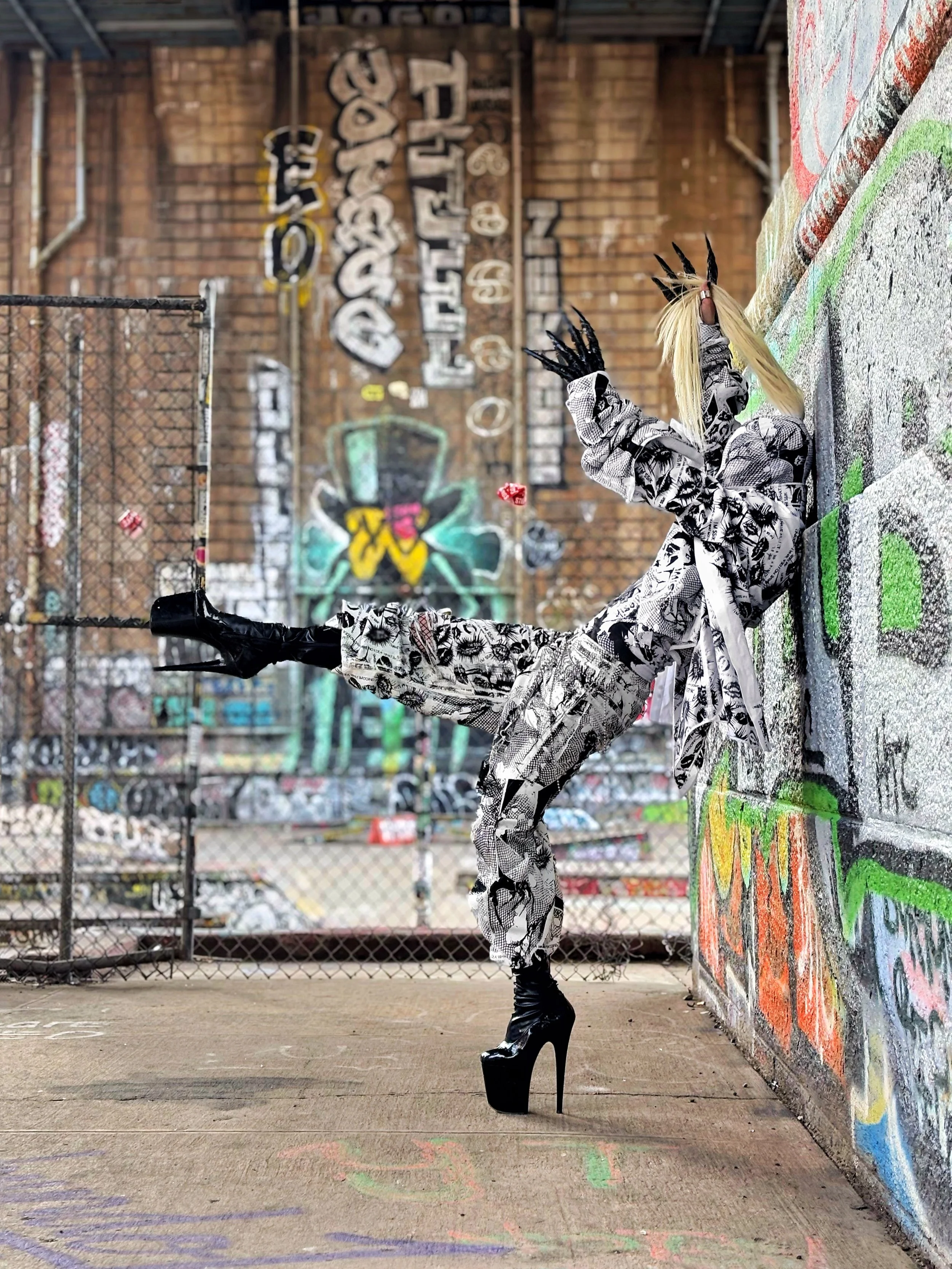 Jessie Paege in custom SSIK Glitter Whore Drip Denim Vest & David Dalrymple Tulle Skirt for Patricia Field